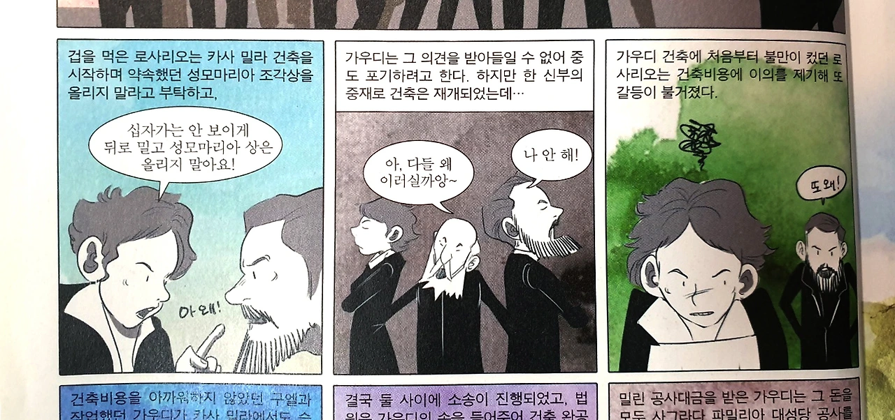 이 설계로 서로 계약을 했지만, 온 성당이 불타고 있는 시국에 어떤 건물주가 그런 큰 위험을 감수하겠는가. 불행인지 다행인지 결국 조각상은 고도제한으로 올리지 못했다. 거기다가 공사금액으로 시비가 붙어 소송으로 갔다. 결국 법원은 가우디의 손을 들어주었고, 공사금액은 모두 사그라다 파밀리아 대성당에 모두 기부했으니, 가우디가 종교에 얼마나 헌신했는지 짐작이 간다. 가우디의 고집은 그뿐만이 아니었다. 건물을 지으려면 설계도를 시청에 제출해서 허가를 받아야 했는데, 가우디는 설계도 대신 석고 모형을 그대로 들고 가 허가를 받으려 했고, 건축의 일부가 건축선 밖으로 나가 있는데도 허가를 내주지 않으면 이 사실을 기둥에 쓰겠다고 으름장을 놓기도 했다. 이것 역시 소송으로 번졌고, 법원은 가우디 건축은 예술적인 가치가 있다며 가우디 손을 다시 들어주었다. 온 도시가 불에 타던 상황에서 가우디의 고집으로 위기를 맞이했던 이 건축물이 바로 카사 밀라(Casa Mila)이다.