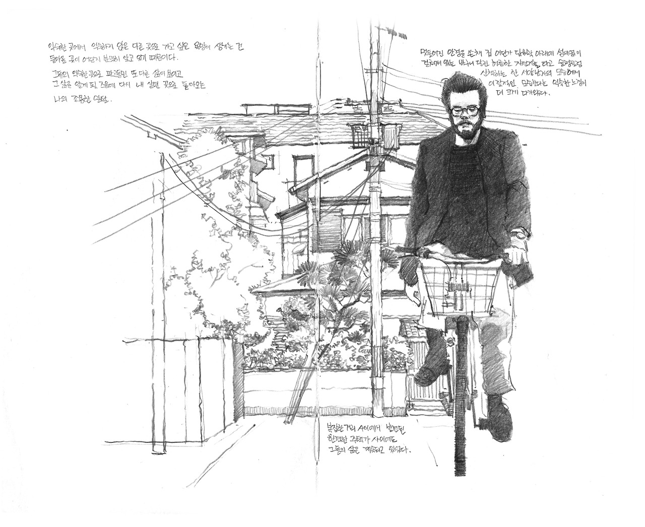 뒷골목에서 만난 자전거를 타는 외국인리어카는 손님을 태우고 정신없이 거리를 돌아다니고 있었고, 길을 건너는 사람들은 부딪힐 듯 말 듯 차를 피해 엉덩이를 넣었다 뺐다 곡예를 부렸다. 대로변에 즐비한 유명 음식점은 소문만 듣고 온 사람들로 대기줄이 잔뜩 늘어져 나는 그앞을 지나가기가 힘들었다. 복잡한 길을 피해 지나다가 나도 모르게 고개를 들어 하늘을 올려다 봤다. 텅 비었을 것만 같았던 하늘은 기대와는 다르게 여기저기 다 헤져 벌어진 니트실처럼 수많은 검은 전깃줄이 얽혀있어 이내 고개를 떨어뜨렸다. 어지러웠다. 내 시선은 안정될만한 무언가를 찾고 있었다. 순간 다른 길이 보여 몸은 그곳으로 의지 없이, 스스럼없이 파고 들어갔다. 들어갈수록 좁아졌던 길 끝을 지나자 넓고 환한 공간이 나타났다. 넓은 공터에 멋들어진 소나무가 있던 주택가였다. 의아했다. 시끄럽던 소리마저 모두 사라졌다. 그러자 어느 한 골목 귀퉁이에서 자전거를 타고 나오는 파란 눈에 얼굴을 수염으로 덮은 남자가 내 옆을 지나갔다. 하루키의 소설 1Q84의 장면처럼 다른 차원으로 들어가 버린 아오마메의 심정과 같았을까. 나는 호기심 많은 새끼 고양이처럼 사람들을 피해 골목으로 들어갔더니 다른 세상을 보았다.