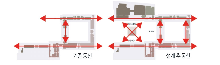 첫 번째, 길고 불편한 L형의 동선을 'ㄷ'형의 동선으로 만들어 루브르 건축을 모두 활용하도록 했다.