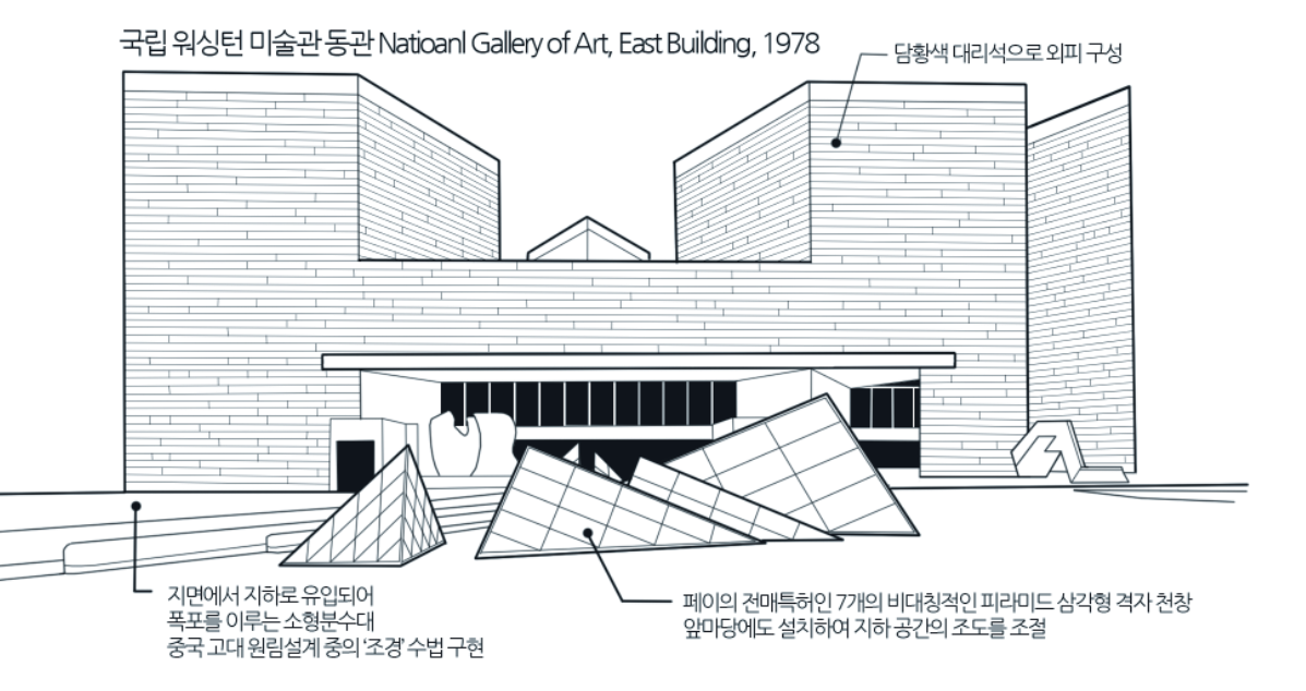 페이 역시 루브르의 유리 피라미드를 갑자기 만들어 낸 것은 아니다. 페이는 그랑 루브르 프로젝트 이전에 건축을 했었다. 워싱턴 국립 미술관 동관이다. 이는 루브르 박물관과 기능이 흡사하다. 미술관 지하로 각 공간을 연결하는 것과 상부 삼각뿔 유리창으로 지하 내부에 빛을 들이는 것은 루브르의 그것과 같다. 신고전주의 건축물인 국립 미술관 본관 옆에 현대건물로 지은 것도 루브르 박물관과 다르지 않다. 미테랑 대통령도 워싱턴 국립 미술관 동관을 직접 보고 나서 페이에게 계획을 맡겼다고 한다.