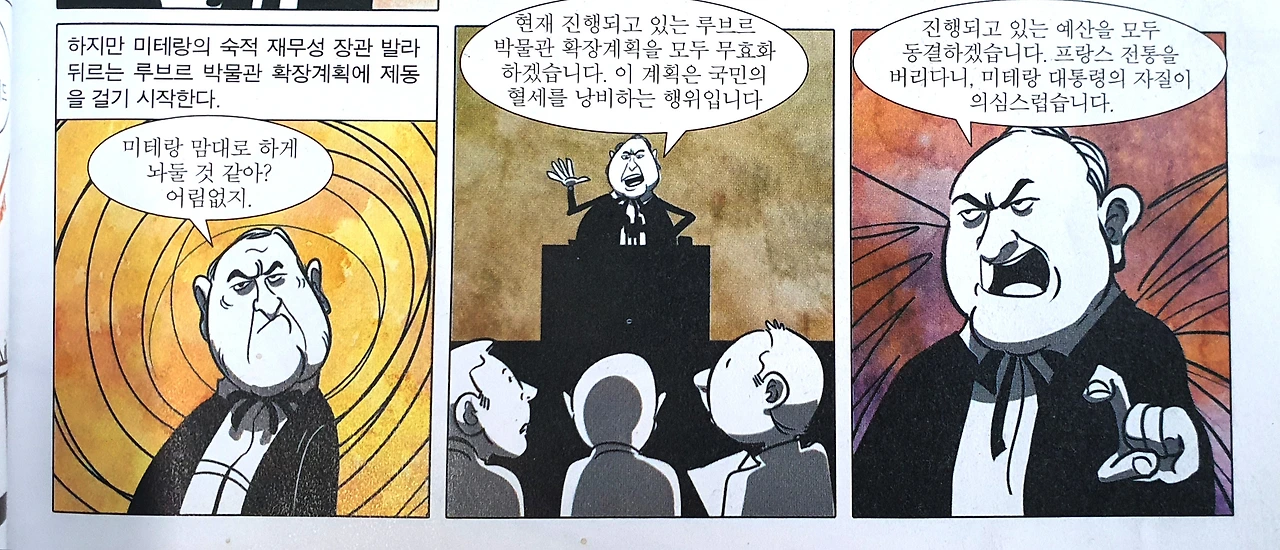 "루브르는 기본적으로 동선이 잘못되었습니다. 건축물 세 동 중, 한 동을 재무성이 사용하고 있어 동선이 막혀있습니다. 그래서 관람 동선이 굉장히 길어져 매우 불편하죠. 그걸 해결하려면, 재무성을 다른 곳으로 옮기고, 건축물의 모든 곳을 박물관으로 사용해야 합니다. 그리고 루브르 건축물이 감싸고 있는 나폴레옹 광장 아래 터미널과 같은 거대한 중앙 홀을 만들면, 동선의 혼잡을 줄일 수 있습니다."