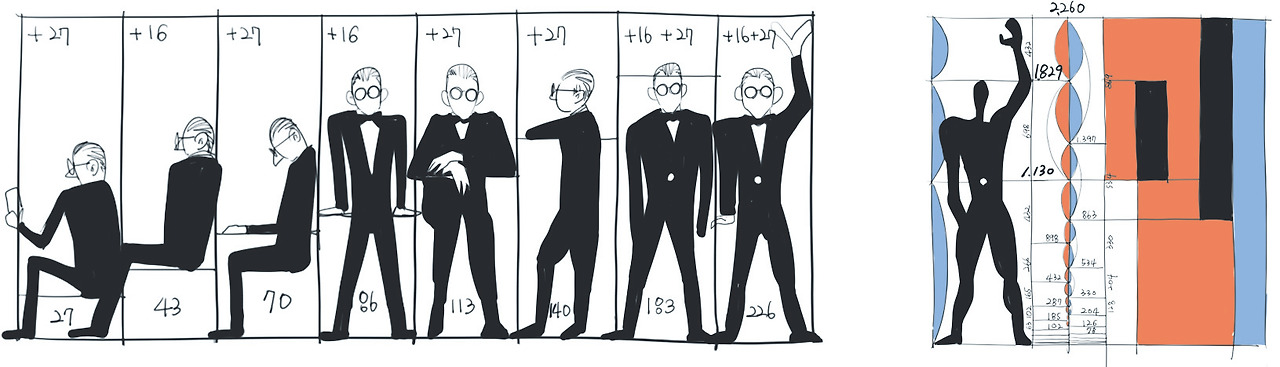 셋째, 그는 인간이 공간 안에서 움직일 수 있는 가장 적합한 황금비율의 척도로 모듈러(modular) 이론을 만들었다. 그는 건축을 인간이 창조한 우주나 다름없다고 생각했다. 그래서 미터법이나 인치법을 기준으로 한 공간 설계는 불편하기 짝이 없었다. 그래서 사람 행동반경이 중심이 되어야 했다. 이 이론은 현재 우리가 쓰고 있는 가구의 폭과 높이, 공간의 길이 등에 그대로 사용되고 있다.