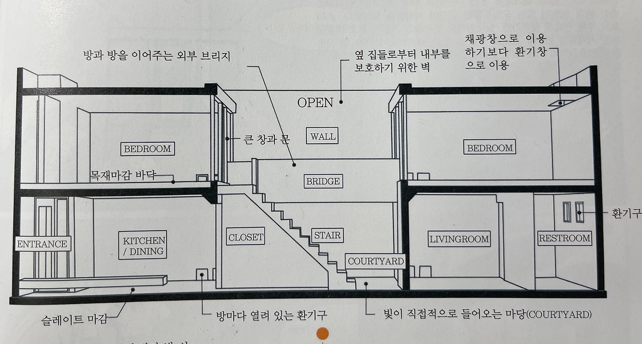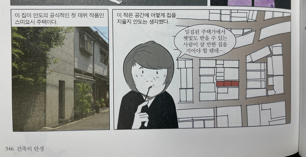 스미요시 주택은 건물 외부에 창이 하나도 보이지 않아 눈코입이 없는 허여멀건한 귀신같이 보이는 데다가 주변과 전혀 어울리지 않게 홀로 고립되어 보이기도 하지만 맑은 날엔 햇볕을 받는 날이면 외려 따뜻해 보이기도 하다. 건물의 안으로 들어서면 밖에서 보이는 것과는 달리 사람이 살기 위해 오목조목 있을 건 다 있는 곳이다. 하늘이 뻥 뚫린 천장이 있는 작은 중정은 또 얼마나 매력적인가. 이는 안도가 어린 시절 외할머니 집 증축 공사일을 도왔는데, 그 때 집 일부를 철거하면서 뚫린 지붕 아래의 그 느낌을 그대로 표현하지 않았나 싶다. 이후 이런 건축언어가 안도의 건축에서 종종 나타나는데, 어린 시절의 강렬했던 경험이 자신의 건축세계에 많은 영향을 받았음을 짐작할 수 있다.