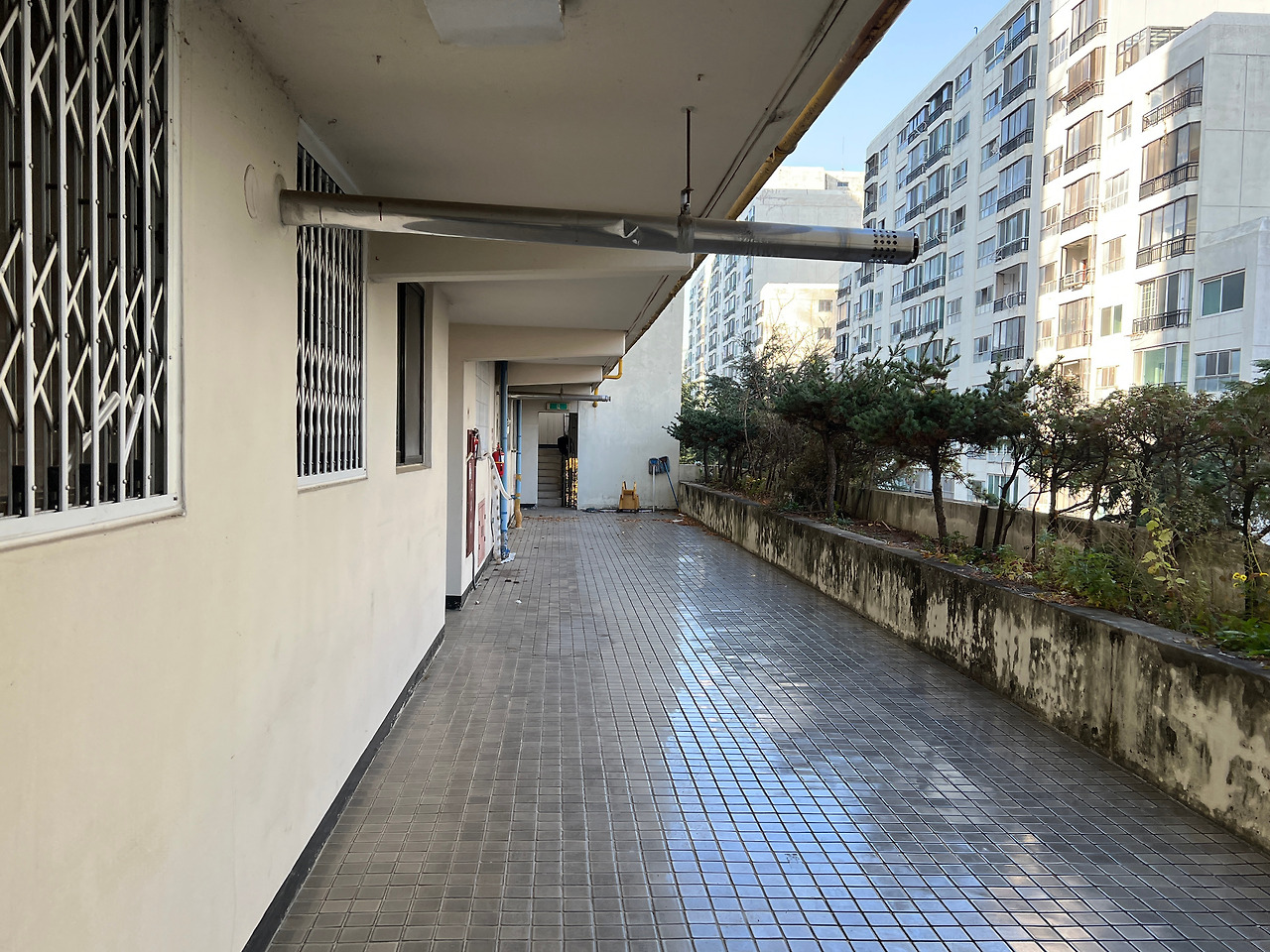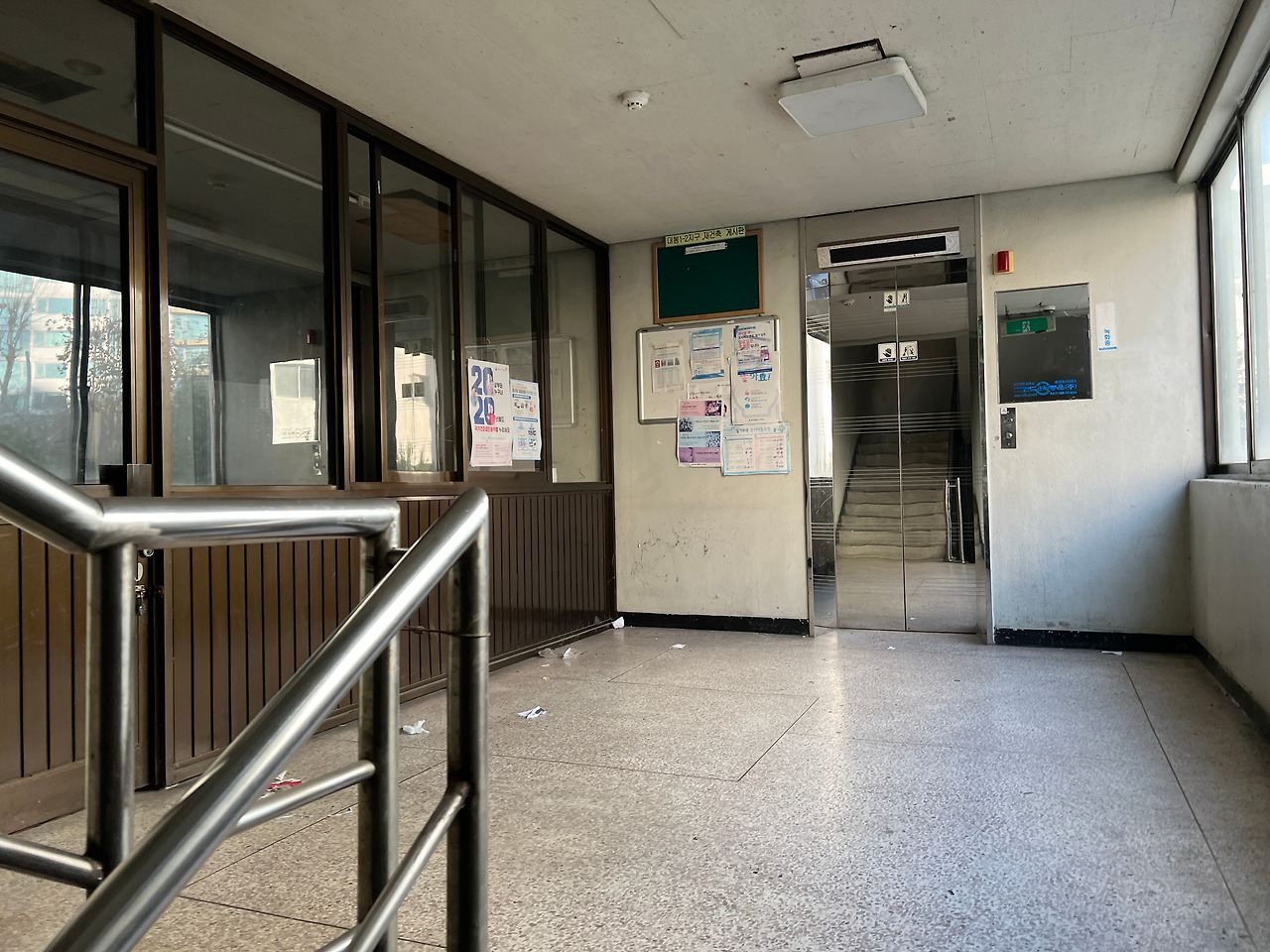 건물을 둘러보려고 필로티 안으로 들어가니 관리 사무실이 있었다. 건물을 관리하시는 할아버지께 건물을 둘러봐도 되냐고 여쭸더니 여긴 이제 아무도 살지 않으니 맘껏 돌아보라고 하시면서 흔쾌히 현관문을 열어주셨다. 이미 엘리베이터는 멈춘 상태라 한 층씩 걸어 올라갔다. 3층에는 아이들이 마음껏 뛰어놀았을 테라스가 보였고, 나무는 그대로 자라고 있었다. 텅텅 비어있는 아파트는 40년 동안 사람들이 살아왔던 흔적만 남아있었다.