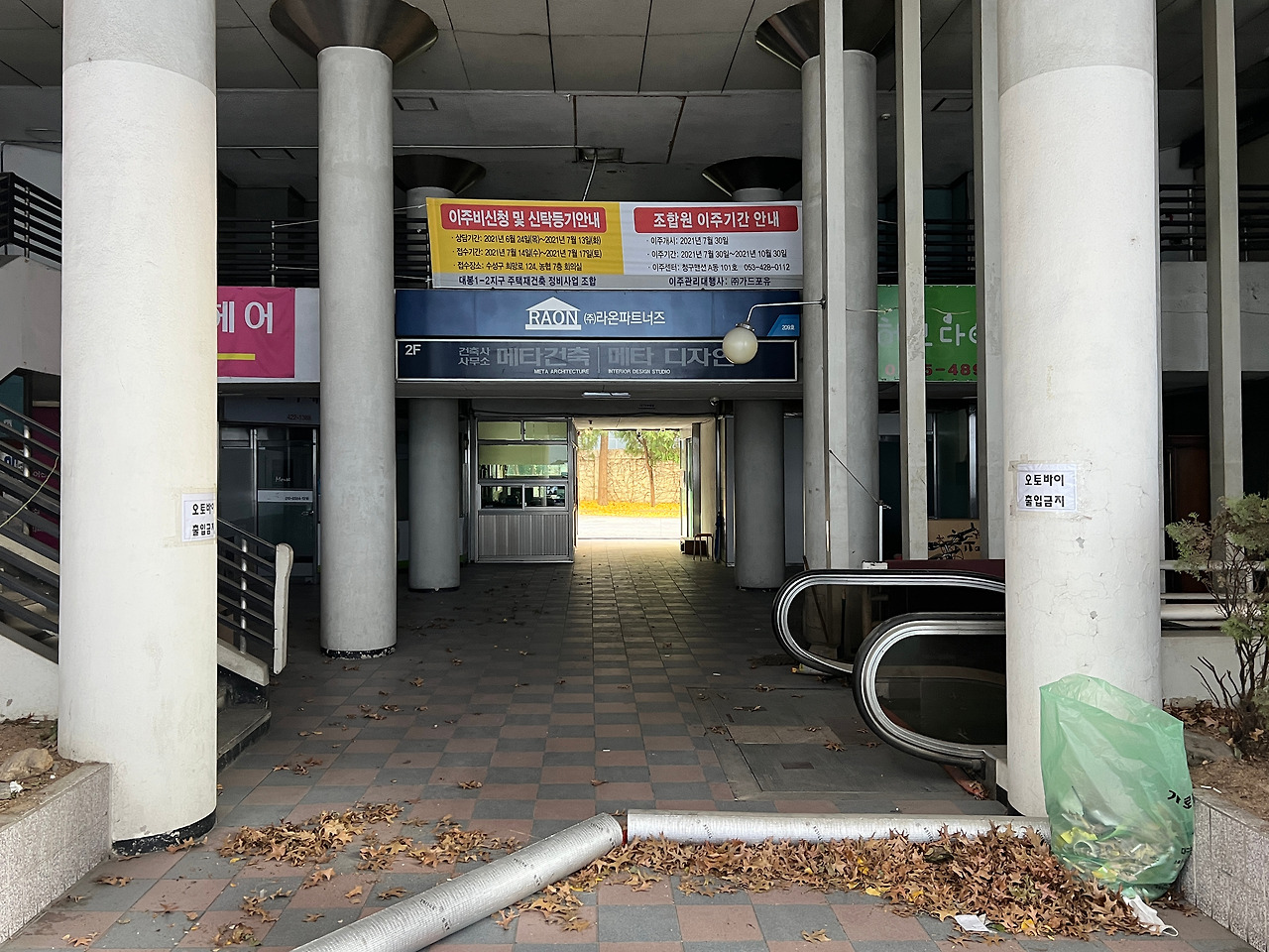 한양 가든 테라스에 도착했더니 주변은 고층 빌딩 공사가 한창이었다. TV에서 보았던 활기찬 아파트의 모습은 없었다. 깨진 유리창과 건축자재가 바닥에 널브러져 있었다. 길 곳곳에는 재건축을 축하한다는 플래카드가 걸려있었고, 반복적으로 연신 뚝딱거리며 울려대는 망치 소리가 들렸다. 뭔가 서글펐다. 한 시대를 풍미했던 대구 중심가를 가로질러 우뚝 서 있었던 아파트는 이제 작고 초라했다. 이젠 과거의 위풍당당했던 자태를 뒤로하고 곧 역사 속으로 사라질 운명이니 내심 아쉬웠다.