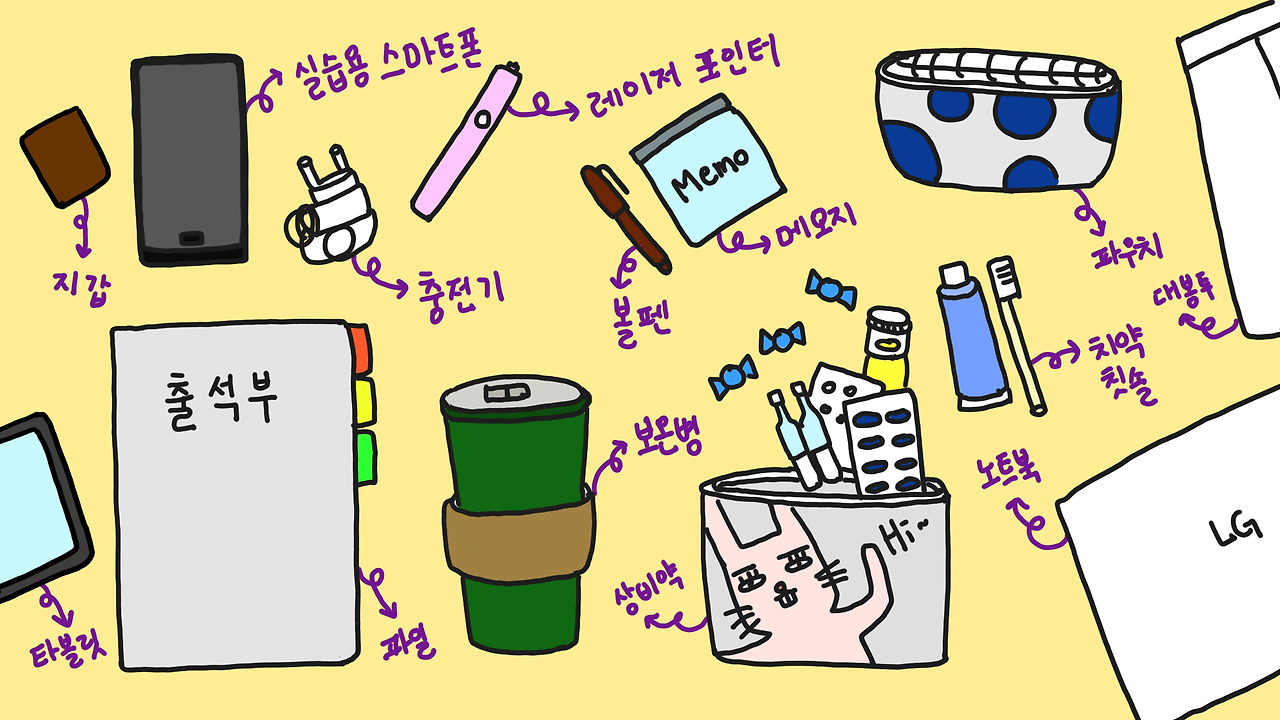1) 스마트폰과 충전기 : 스마트폰으로 출결부터 e-class 접속까지 가능하다. 수업 특성상 스마트폰으로 실습해야 할 때가 있다. 이때를 대비해서 실습용 폰이 따로 있다.