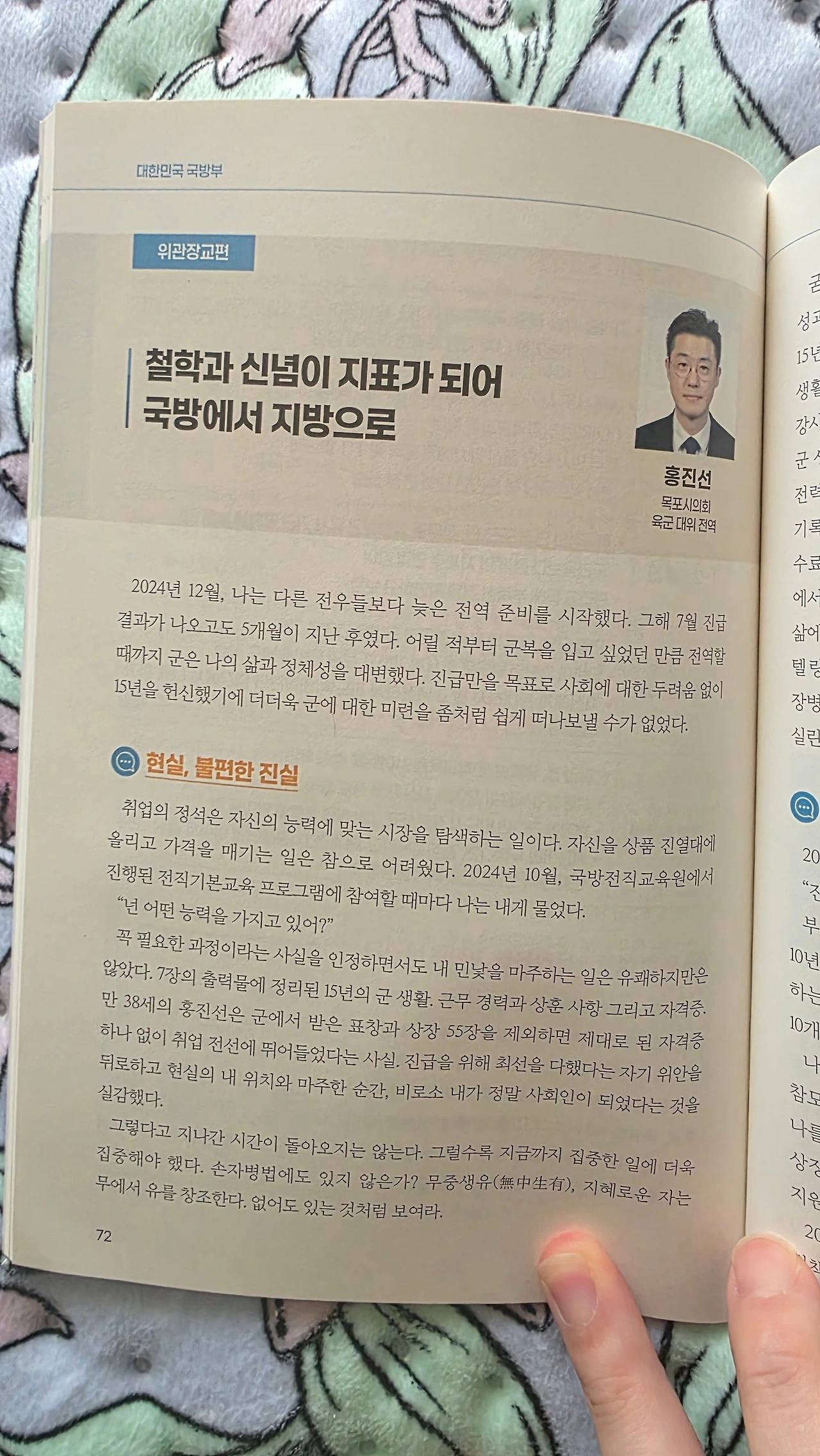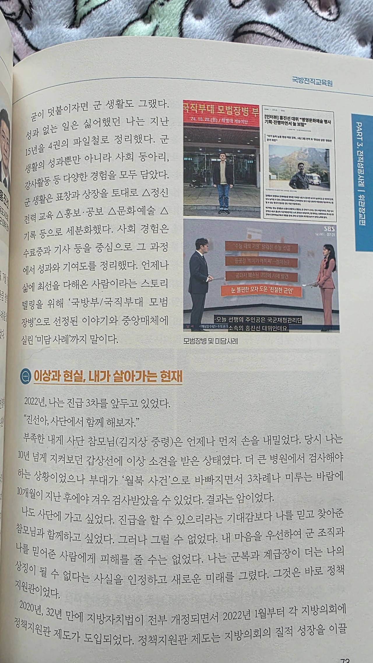 2022년, 나는 진급 3차를 앞두고 있었다. “진선아, 사단에서 함께 해보자.” 부족한 내게 참모님(김지상 중령)은 언제나 먼저 손을 내밀었다. 당시 나는 10년 넘게 지켜보던 갑상선에 “더 큰 병원에서 검사가 필요하다”라는 의사의 소견을 받은 상태였다. 그러나, 부대가 ‘월북사건’으로 바빠지면서 3차례 검사 시기를 미루게 되었다. 결국, 예정된 검사 시기보다 8개월이 지난 후에야 검사를 받을 수 있었다. 그것은 암이 되었다. 나도 사단에 가고 싶었다. 진급을 할 수 있을 것이라는 기대감보다, 나를 믿고 찾아준 참모님과 함께하고 싶었다. 그러나 그럴 수 없었다. 분명 조직과 나를 믿어준 이에게 큰 피해를 줄 것이라 생각했기 때문이다.