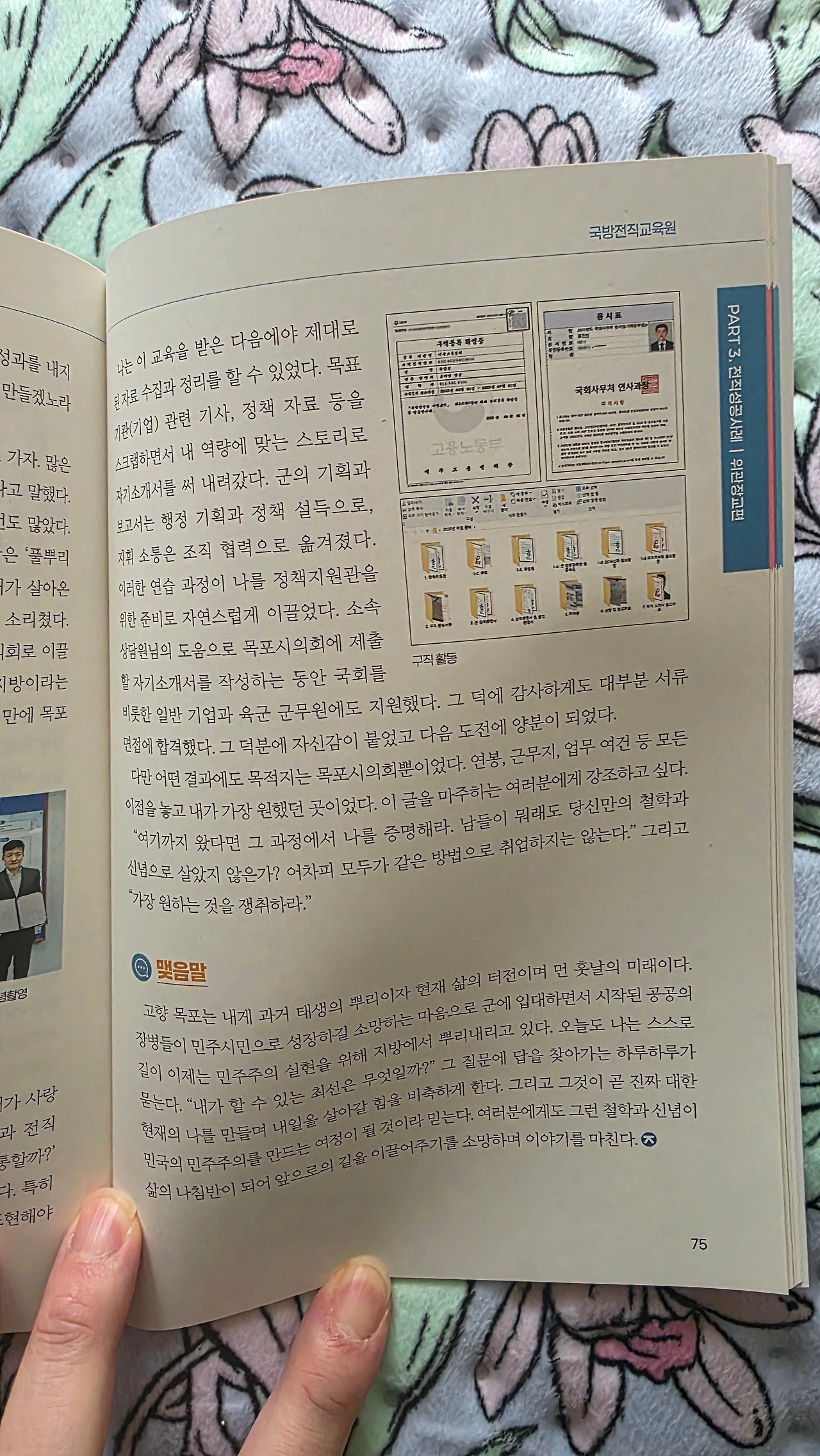 나는 이 교육들 이후에야 제대로 된 자료 수집과 정리를 할 수 있었다. 목표 기관(기업)에 대한 관련 기사, 정책자료 등을 스크랩하면서 내 역량에 맞는 스토리로 자기소개서를 써 내려갔다. 군의 기획과 보고서는 행정기획과 정책설득으로, 지휘소통은 조직협력으로 옮겨졌다. 이러한 연습 과정이 나를 정책지원관을 위한 준비로 자연스럽게 이끌었다.