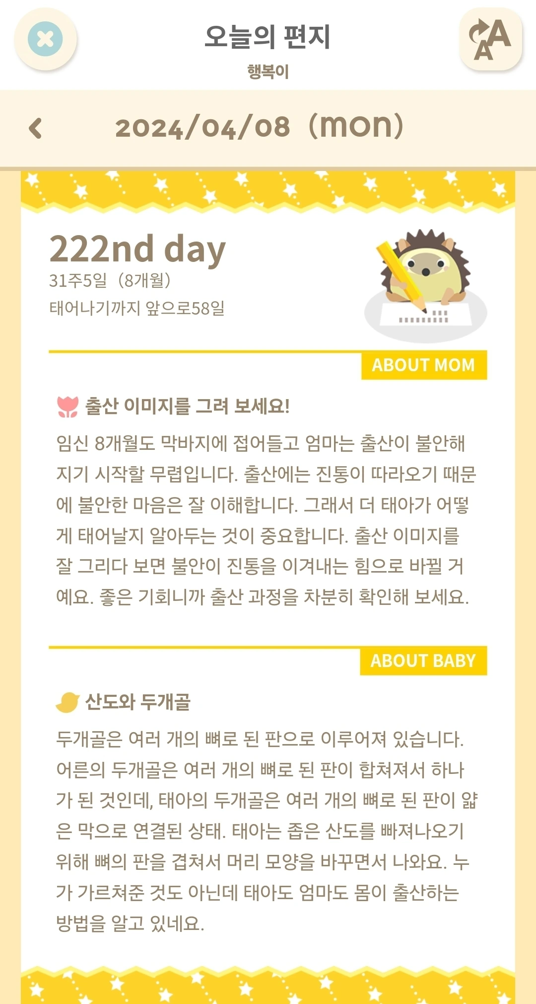 임신 관련 많은 어플이 있는데 그중에서도 280days가 가장 상세한 설명을 볼 수 있다. 매일매일 오늘의 편지라고 해서 주수에 맞는 세세한 읽을 거리를 제공해준다. 개인적으로는 <임신출산육아 대백과>보다 이 어플이 주수에 대한 정보를 더 많이 얻을 수 있었다.