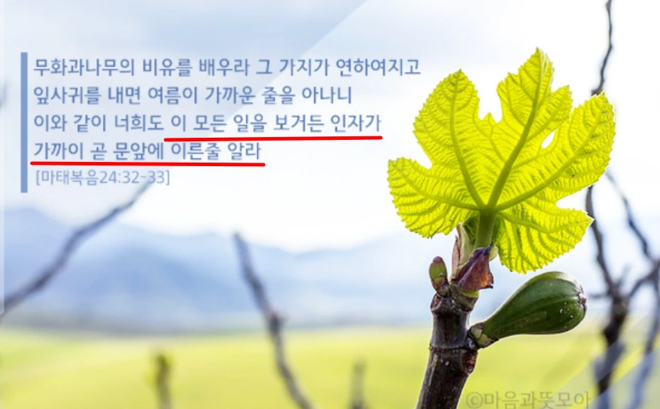 무화과 나무의 비유를 배우라 그 가지가 연하여지고 잎사귀를 내면 여름이 가까운 줄을 아나니 이와 같이 너희도 이 모든 일을 보거든 인자가 가까이 곧 문앞에 이른줄 알라