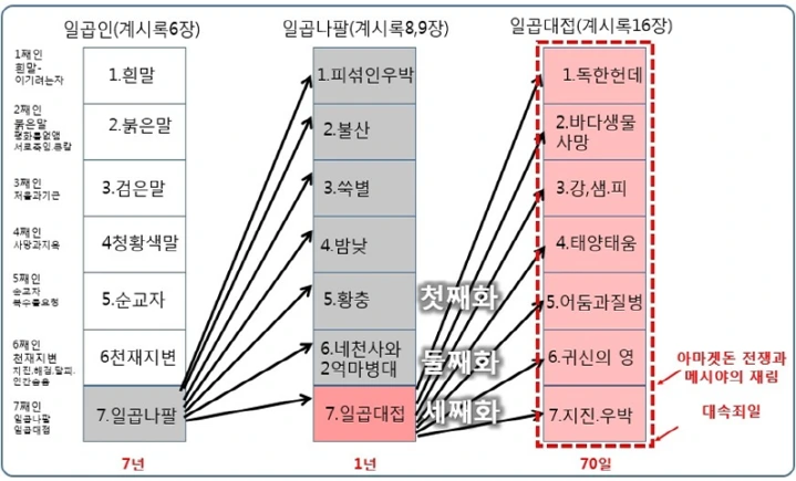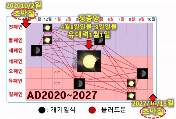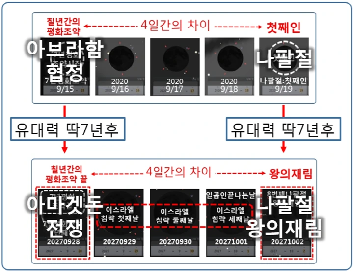 그 외 계시록 및 예언서에 등장하는 난해 성구 및 날짜들이 놀랍게도 이 징조 안으로 정교하게 맞아 들어간다.)