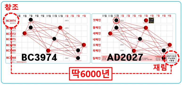 또한 BC 3974년은 정황 상 인류 역사 마지막 해라고 의심되는 2027년으로부터 정확히 6천 년 전이었고, 또 마지막 때와 동일한 모양의 육각도형과 여자의 징조까지 발견됐기에, 이 해가 천지 창조의 해라는 의심이 들 수밖에 없었다. 그리고 그 달력의 모양을 살펴보니 아래와 같았다.