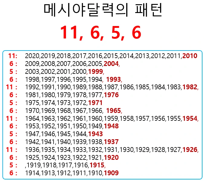 그랬더니 서기력(우리가 쓰는 달력)은 11, 6, 5, 6년의 간격 패턴으로 동일한 달력이 끊임없이 반복되고 있음을 발견했다.