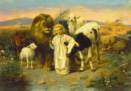 "그 때에 이리가 어린 양과 함께 거하며 표범이 어린 염소와 함께 누우며 송아지와 어린 사자와 살진 짐승이 함께 있어 어린 아이에게 끌리며 /