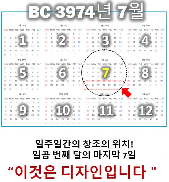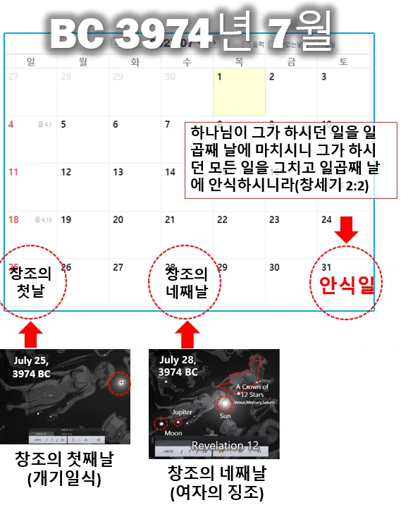 이 추론이 맞다면 위 달력은 창세기에서 하나님께서 6일 간의 천지창조를 마치고 안식하신 원조 안식일의 달력인 것이다.)
