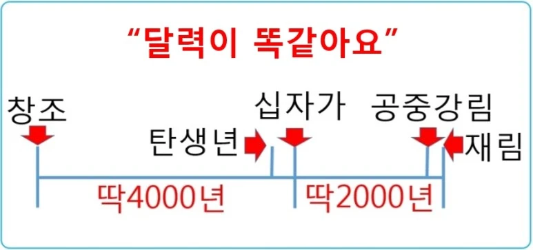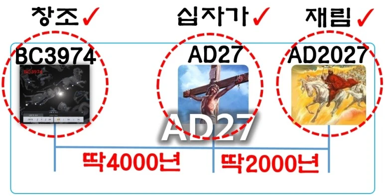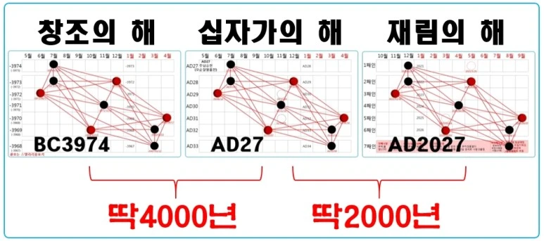 세 육각도형은 정확히 4천 년, 2천 년 차이였다. 성경에 의하면 인류 역사는 6천 년이고, 약 2천 년 전에 예수님의 십자가 사건이 있었다.