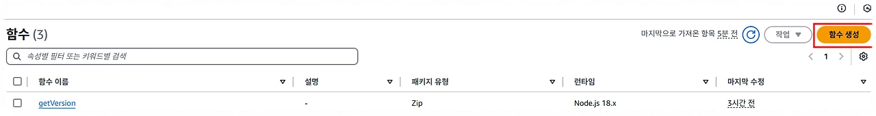 AWS의 람다함수의 페이지에 들어가서 [함수 생성]을 클릭한다.