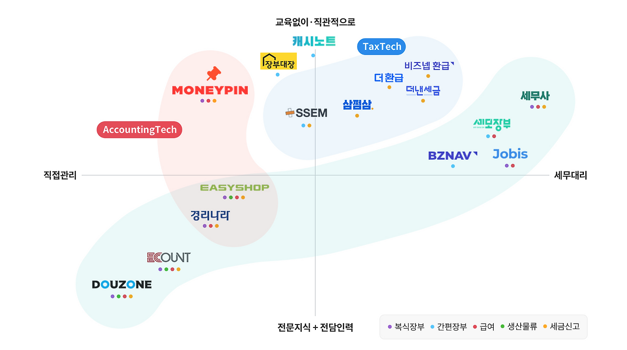 세무・회계 관련 서비스 중 세금신고 기능은 없지만 두각을 나타내고 있는 캐시노트, 경리나라, 비즈넵 그리고 머니핀 서비스를 비교・검토하며 시장을 분석하려고 한다.
