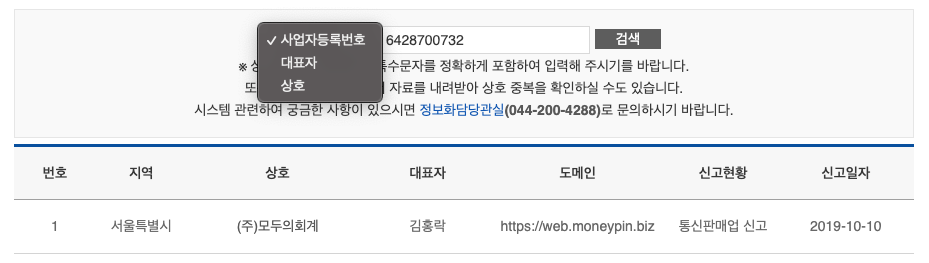 사업자등록번호, 대표자, 상호로 검색이 가능하고 검색된 상호를 클릭하면 상세정보를 확인할 수 있다.