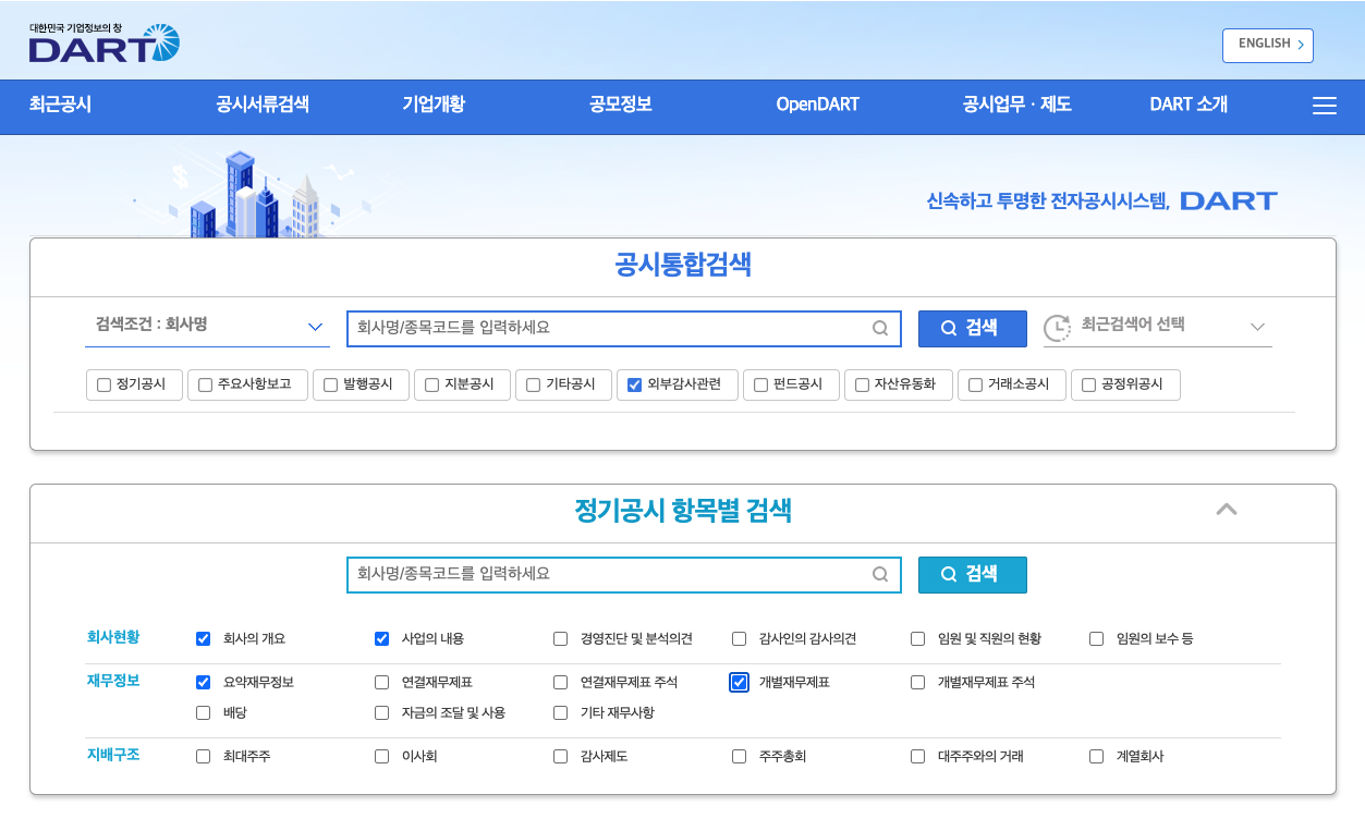 DART를 통해 공시되는 정보는 회사의 개요, 사업의 내용, 개별 재무제표까지 회사의 내부 상황을 제외한 대부분의 내용을 확인할 수 있지만 외감법에 따라 외부 회계감사를 받는 법인에 대한 정보만 공시된다.