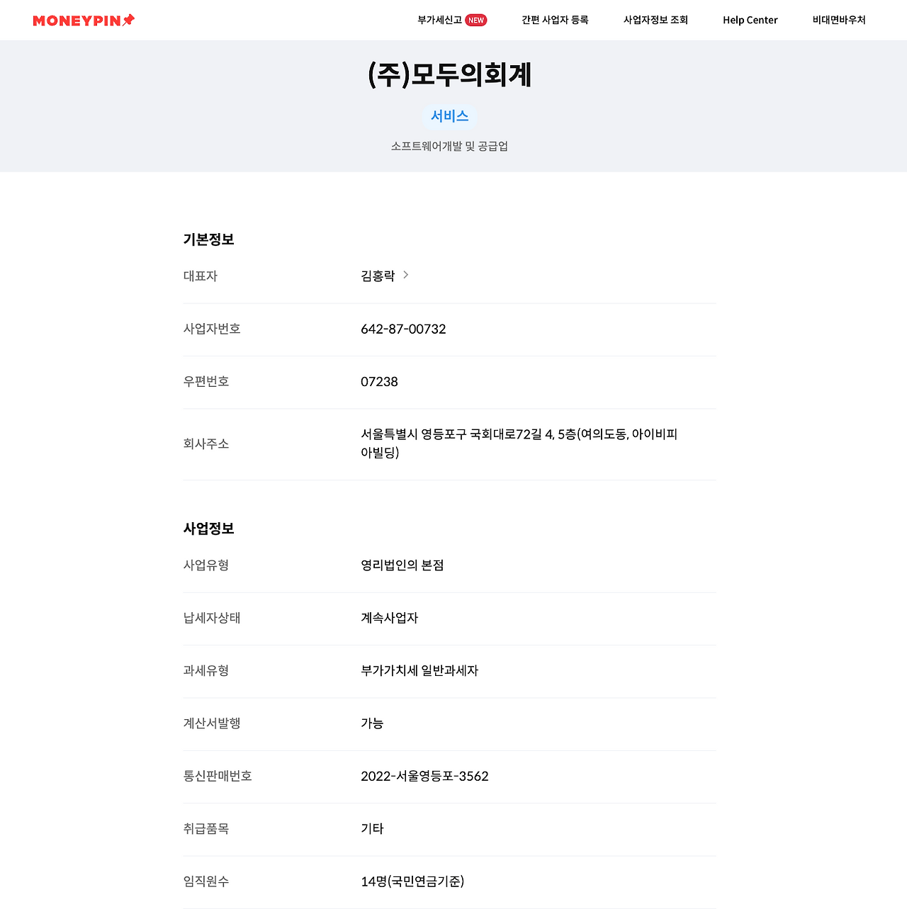 머니핀 자체 DB에 국세청API, 공정거래위원회, 국민연금, 금융위원회의 공개된 데이터를 취합하여 사업자정보를 체계화하여 다음과 같은 정보를 제공하고 있다.