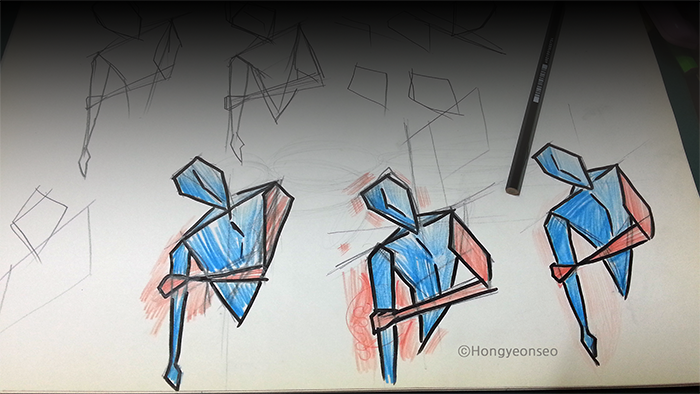 1. 이 편지지에 그린 그림은, 우울에 빠져 있는 사람을 그린 거예요. 고개와 팔을 늘어뜨리고 있고, 온몸이―머리와 가슴까지도 차가워졌죠. 그렇게 굳어진 몸이 자신의 전부같이 느껴지지만, 살아 있다면 아직 따뜻한 곳이 있다는 뜻일 거예요. 따뜻한 한쪽 손으로 다른 쪽을 녹이기 시작했네요. 온기가 서서히 퍼지고 있어요.