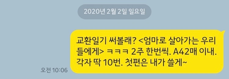 현진 : 겨울 지나고 막 코로나 시작될 때쯤이었어요. 임경선, 요조님이 함께 쓴 <여자로 살아가는 우리들에게>를 보다가 교환일기 써볼까? 생각이 들었어요. 주영님에게 딱 10편씩만 써보자고 꼬셨죠. 그때만 해도 20편은 금세 쓸 거라 생각했는데 8개월 넘게 걸렸네요. 총 21편의 글을 썼어요.