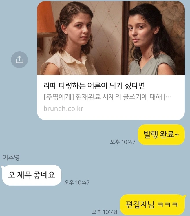 현진 : 확실히 혼자 글 쓰는 것과는 달랐어요. 구체적인 독자를 상상하며 글을 쓰게 된달까. 저와 주영님은 잘 맞는 동료였지만 토끼와 거북이처럼 스타일이 정말 다르거든요. 주영님이 어떤 답장을 보낼까 설레면서 글을 기다리는 게 즐거웠어요. 같은 주제에 대해서 이렇게 생각할 수도 있구나 의외성을 발견하는 것도 재밌었고요.