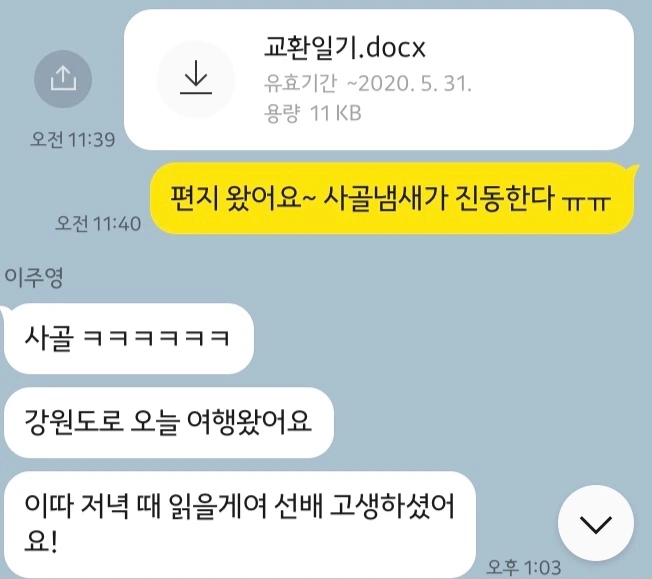 주영 : 학창 시절 친구에게 편지 쓰듯 끄적이면 되겠지 싶었는데 예상보다 훨씬 어려웠어요. 현진님과는 이미 마더티브에서 활동하며 같이 글을 쓴 적이 있어서 서로의 경험이나 가치관, 문제의식을 조금 알고 있었거든요. 이미 했던 얘기는 또 하지 않으려고 나름 노력했는데 쉽진 않더라고요. 반대로 현진님 교환일기에는 제가 몰랐던 그의 새로운 생각, 진심 등이 담겨 있어 새로웠어요.