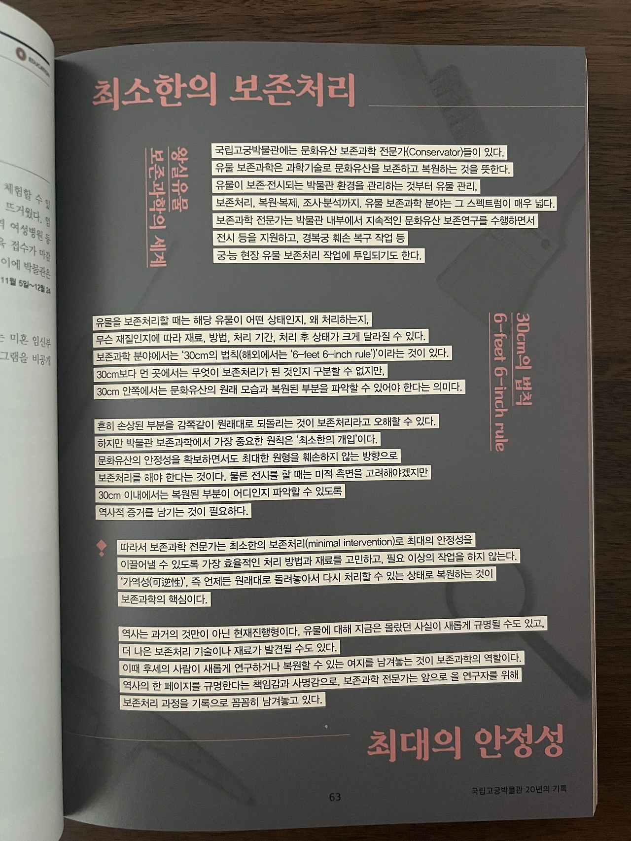 -책은 박물관의 지난 20년을 돌아보며 매해의 주요 이슈를 신문 형식으로 풀어내고, 중간중간 특집 기사로 인터뷰와 기획 기사를 실었다. 박물관 개관 준비 과정부터 박물관 유물, 전시, 교육 등에 얽혀 있는 이야기를 들으면서 ‘박물관이 살아있다’라는 말을 실감했다. 이름이나 이미지로만 알고 있던 문화유산에 이토록 많은 서사가 켜켜이 쌓여 있다니. 날날이가 왜 역사를 재밌다고 하는지 알 것 같았다. 역사는 과거에 고여 있는 것이 아니라 현재와 끊임없이 연결된다. 지금 이 순간에도.