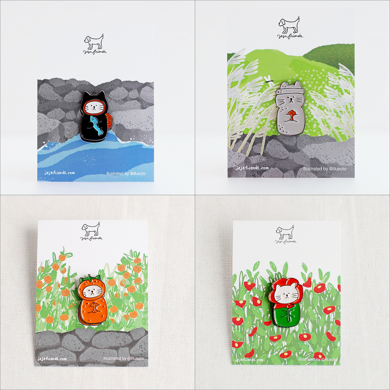 그래서 뱃지까지 제작해보기로 했죠. 표지에 있던 해녀 고양이와 돌하르방 고양이를 응용해서(해당 일러스트 작가님에게) 뱃지를 디자인했어요. 그런데 생각보다 인기가 좋은 겁니다. 그래서 귤 고양이와 동백 고양이까지 만들게 되었죠.