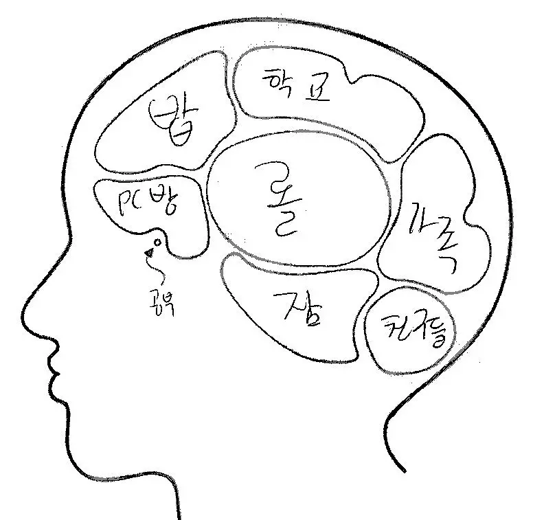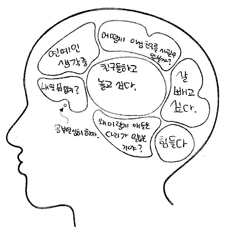 학생들에게 무슨 생각을 하고 있는지 뇌구조를 직접 그려보라는 설문을 했다. 설문 참가자는 중학교 1학년부터 재수생까지 남녀 100명 정도이다. 학생들은 키득키득거리며 친구들의 뇌구조와 자신의 뇌구조를 비교해가며 열심히 본인의 머릿속을 탐색해보는 시간을 가졌다. 심지어 다른 사람의 뇌구조를 커닝? 하는 애들도 있었다. 학생들의 뇌 구조는 다른 듯 비슷했다. 각 학년별 대표성을 띄는 뇌구조를 직접 확인해 보자.