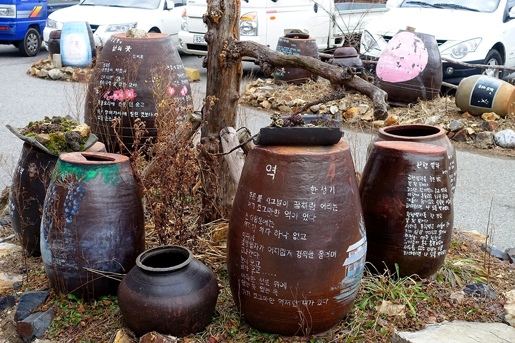 역 광장에는 시를 써놓은 항아리들이 가득하다. 시를 써놓은 색 바랜 기왓장도 많다. 그것들을 역사 주변 곳곳에 예쁘게 배치해놓았다. 그 덕분에 평범한 시골 역이 고상하고 우아하게 변했다. 황간역에는 그렇게 시들이 주렁주렁 열려 맛있게 익어간다. 시를 알지도 쓸 줄도 모르지만, 시가 있어 황간역이 정겹게 느껴진다.