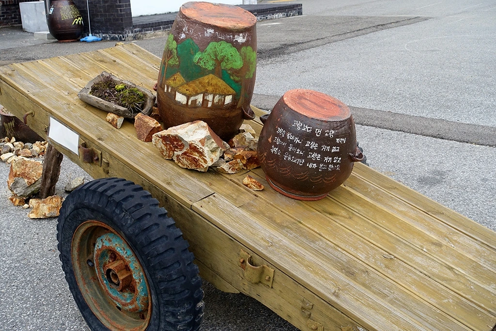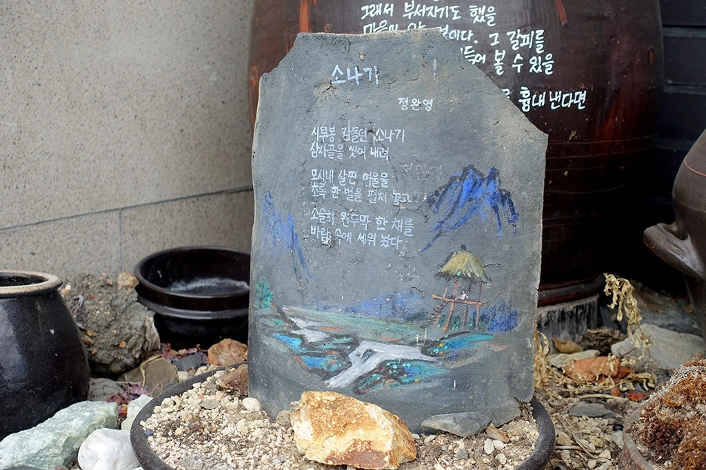 플랫폼으로 나가는 대합실 문을 조심스럽게 밀쳐본다. 괜히 그랬다 싶을 정도로 걸리는 것 없이 문이 열린다. 플랫폼 주변에도 정감 어린 소품과 시를 적은 기와와 항아리들이 곳곳에 자리를 차지하고 있다. 황간역에서 시가 태어나 자라고 익어간다.