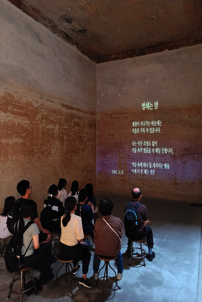 콘크리트 한쪽 벽면이 스크린이고, 엉덩이를 겨우 걸칠 수 있는 동그란 의자가 있을 뿐이다. 그 외에 다른 잡다한 건 보이지 않았다. 다른 박물관이나 전시관이었으면 이런 단출한 모습이 살짝 의아스러웠을 수도 있었을 테지만, 윤동주 문학관에서는 거칠고 투박한 이런 모습이 그의 삶과 왠지 더 어울려 보였다.