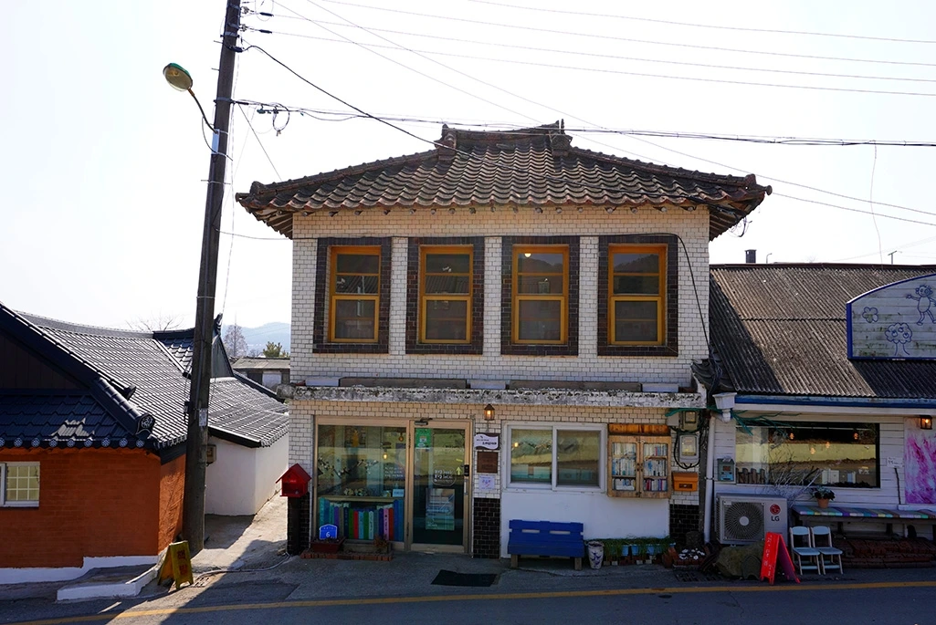 면천 읍성 안쪽 마을은 그와 달리 사람들이 생활하는 삶의 공간이었다. 그렇기에 이런 곳이 아직 남아있는 게 놀랍고 신기했다. 건물 벽에 하얀 타일을 바른 이 층 건물이 보였다. 건물에는 ‘오래된 미래’라는 책방이 들어있었다. 이렇게 작은 마을에서 책방이 될까 싶은 생각이 들었지만, 그보다 먼저 이렇게 타일이 붙은 건물을 보는 게 정말 반가웠다.
