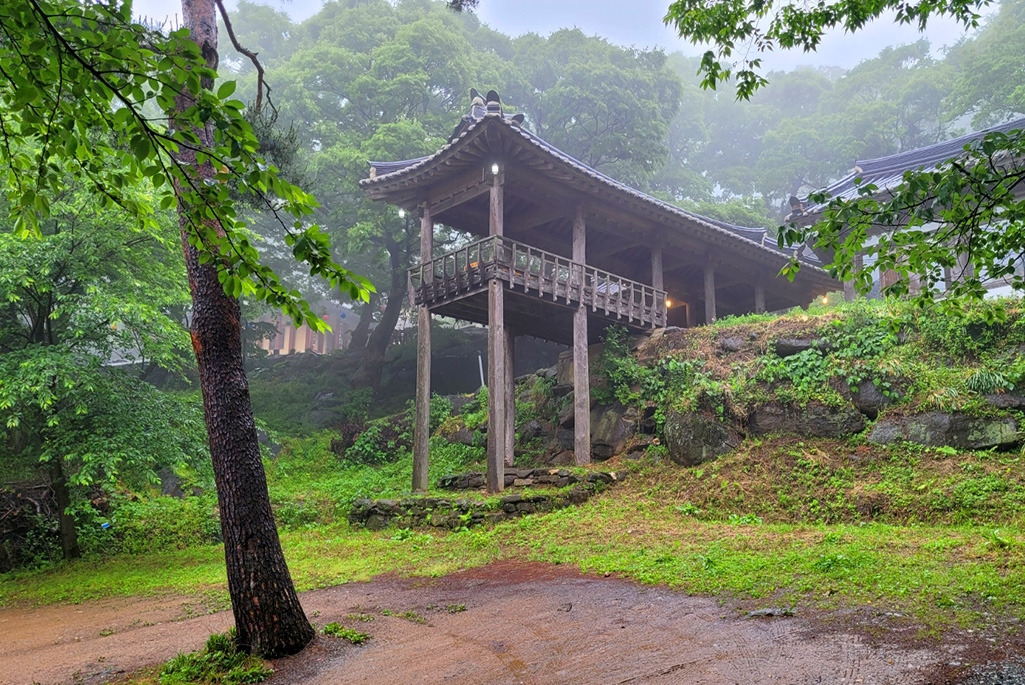 그 경치에 매료되어 조금 전까지 비 때문에 불편했던 마음이 이내 사라지고 말았다. 그 빈자리에는 부풀 대로 부푼 기대감과 설렘이 가득 들어찼다. 쏟아지는 빗줄기를 우산으로 막으면서 금강문으로 발걸음을 떼어놓았다. 발걸음은 금강문을 향하고 있지만, 눈길은 왼편에 보이는 누각에 빼앗겼다. 정자와 누각을 좋아하다 보니까 누각을 보자마자 당연하게 관심이 갔다.
