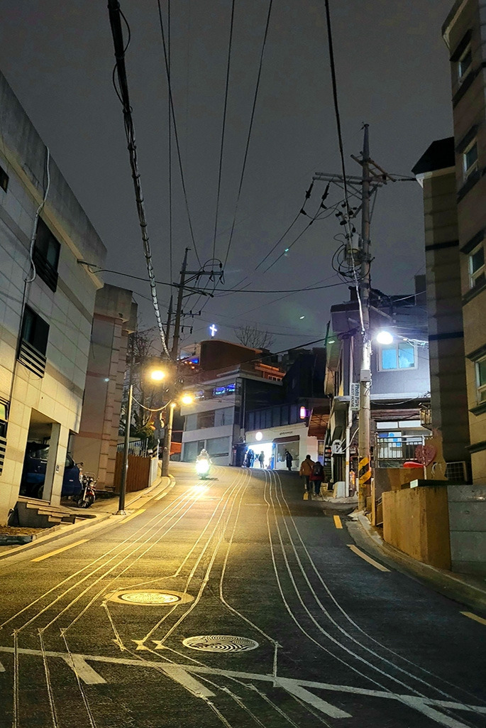 옛 추억을 떠올리며 걷다 보면 도로 바닥에 굵게 그어진 선들이 눈길을 끌었다. 처음에는 도로 공사를 하려고 아스팔트를 갈라놓았나 했는데, 그게 도로의 열선이라는 걸 금방 짐작할 수 있었다. 이런 시설이 없으면 눈이 오거나 빙판길이 되면 버스나 자동차가 경사진 도로를 다니기가 쉽지 않을 것이다. 길바닥에 연탄재를 뿌렸던 옛 시절을 생각하면 세상이 좋아지긴 많이 좋아졌다.