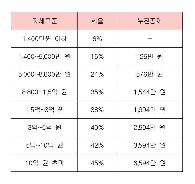 다음 표는 한국 소득세율이다(2023년 기준). 보다시피 억대 연봉자들 세율은 정말 높다.