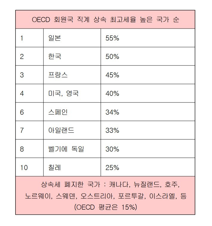 세상 룰이 다 그렇다면야 포기하고 사는 수밖에. 그런데 세상이 다 한국 같지는 않다. OECD 국가들 중에서도 한국은 증여세와 상속세 세율이 매우 높은 국가다. 최고구간 세율이 50%나 된다.