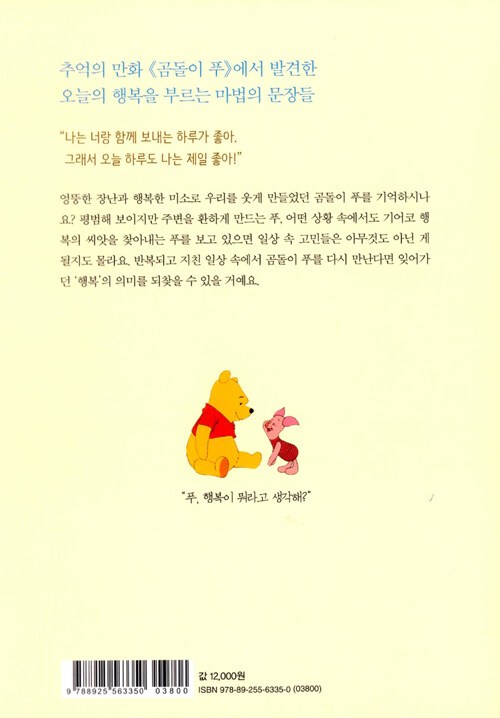 이 책은 크게 세 부분으로 되어 있습니다. <1부, 인생의 늪에서 빠져나오는 힘>, <2부, 모든 문제는 생각보다 단순하다>, <3부, 인생이라는 숲 속에서 나를 잃지 않으려면> "지금 힘들더라도 기운을 내서, 단순하게 생각하며 문제를 이기고, 나만의 길을 찾아가세요~" 말하면서 방긋 웃어주는 푸가 떠오르는 구성입니다.