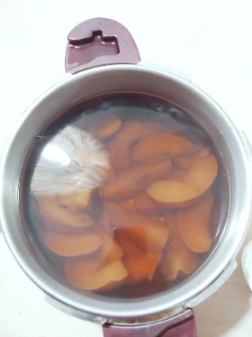 배를 깎아 압력솥에 넣고, 구슬처럼 후추를 박아준다면 왼쪽 그림과 같이 되겠습니다만... (귀찮으므로) 후추 8~10알을 그냥 솥 안에 넣고, 준비했던 도라지와 생강을 넣어줍니다. 여기에 물 1.5~2L를 추가해주세요. 이 상태로 압력솥을 닫고, 센불에서 빠글빠글 끓이다가, 압력솥의 추가 회전을 하면, 불을 약하게 줄여서 5~10분간 더 끓여주세요. 약한불로 끓이는 것은 마치 약재를 달여주는 듯한 느낌이지요. 의식동원(醫食同原)이라, 먹는 것과 병을 치료하는 것은 인간이 건강을 유지하도록 하므로 그 근원이 같다는 말이지요 (다음사전). 이 과정을 통해서 모든 재료들이 갖는 이로운 성분들이 우리에게 약처럼 직접 도움이 될 수 있게 잘 어우러지며 녹아 나오길 기다리는 것입니다.