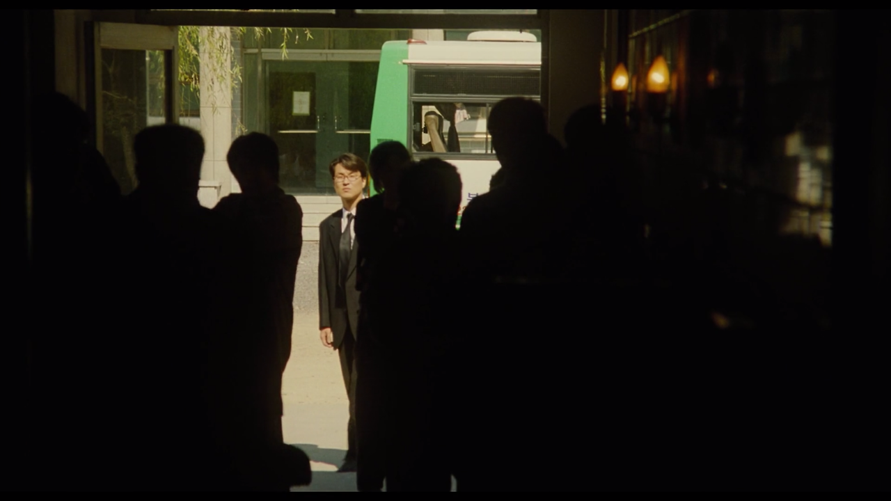 일반 사람들의 모습은 역광으로 까맣게 묘사하면서 정작 죽음을 앞둔 정원의 모습은 똑바로 보여주는 대비가 인상적이다. 정원은 마치 자신의 미래를 보는 듯한 느낌을 받았을 것이다. 자신의 가족과 친구들도 저렇게 슬퍼하지 않을까하는 정원의 참담한 심정이 표정에서 드러난다. 이 장면을 다르게 보면 정원의 영혼만이 장례식에서 맴도는 듯한 느낌을 주면서 삶과 죽음에 대한 대비, 그것에서 느끼는 정원의 소외감을 아이러니하게 표현해낸다.