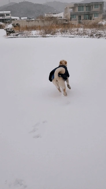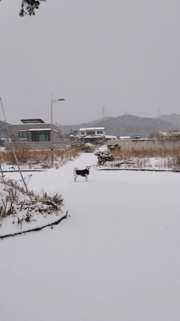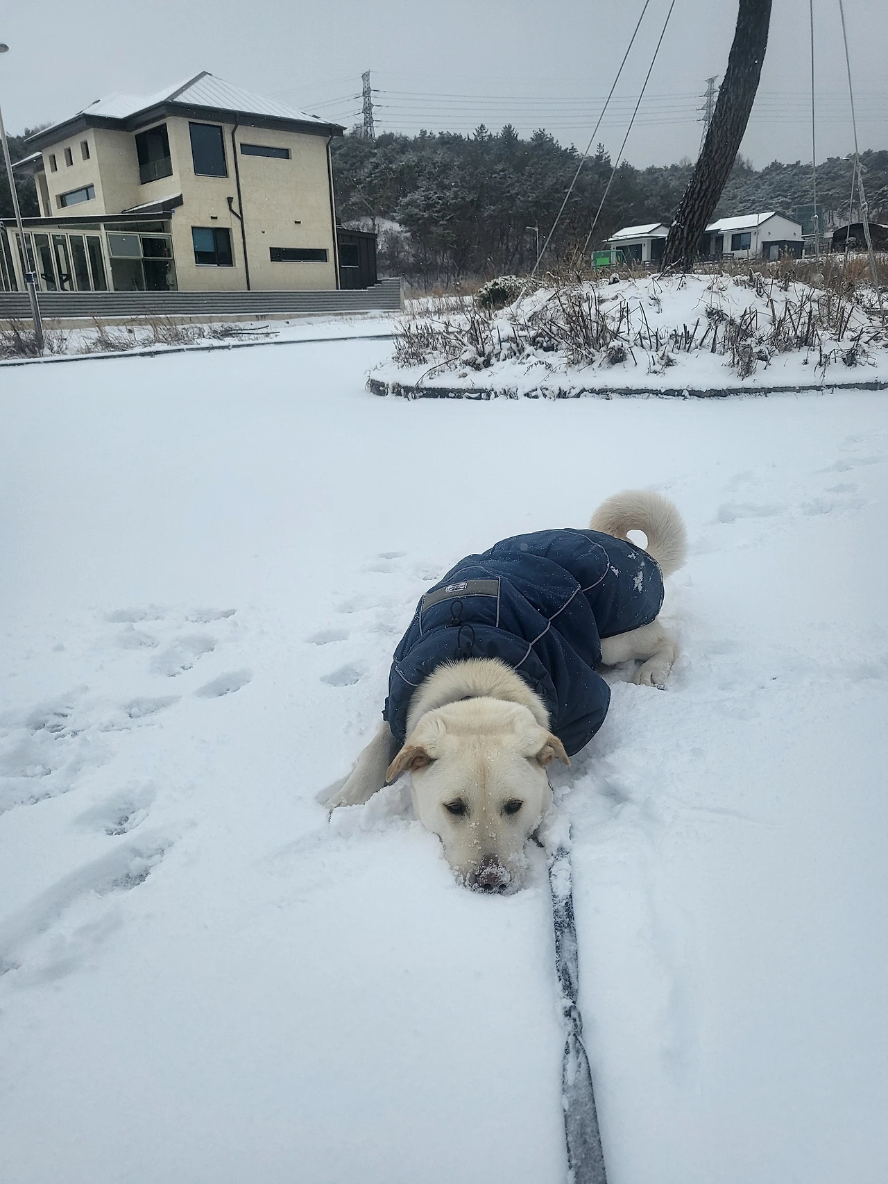 그치만 엄마아빠가 보내준 사진과 영상 속 망고는 눈이라면 환장하던 갱아지가 아니던가! 고민 없이 두꺼운 패딩을 두르고 망고와 눈 구경에 나섰다.