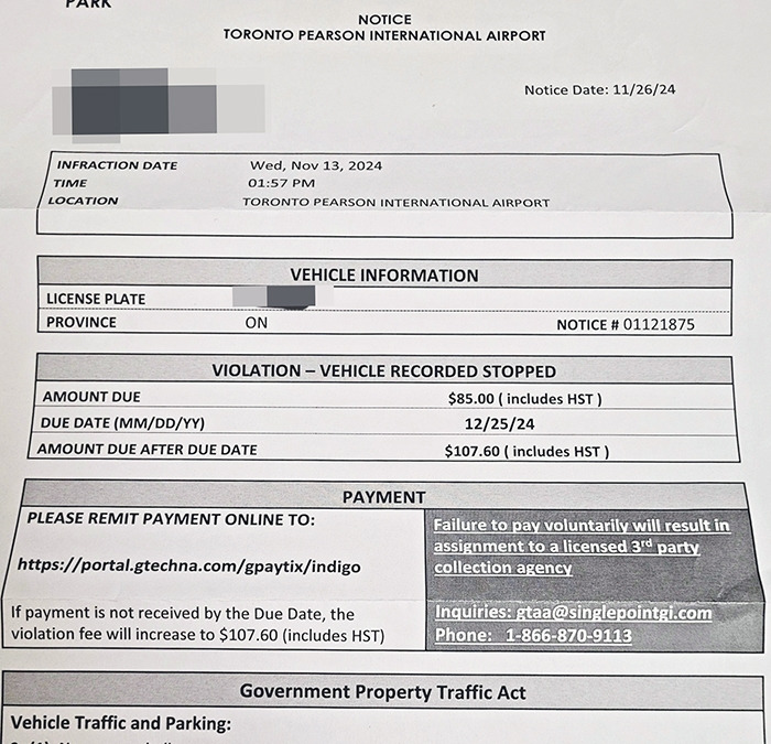 지난해 연말, 토론토 피어슨공항에 픽업을 나갔던 한인 A씨도 '가짜 주차위반 티켓'을 받았다.