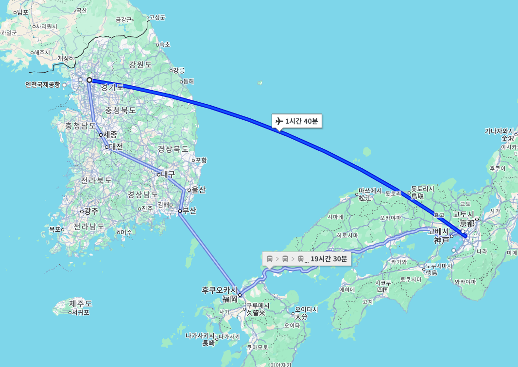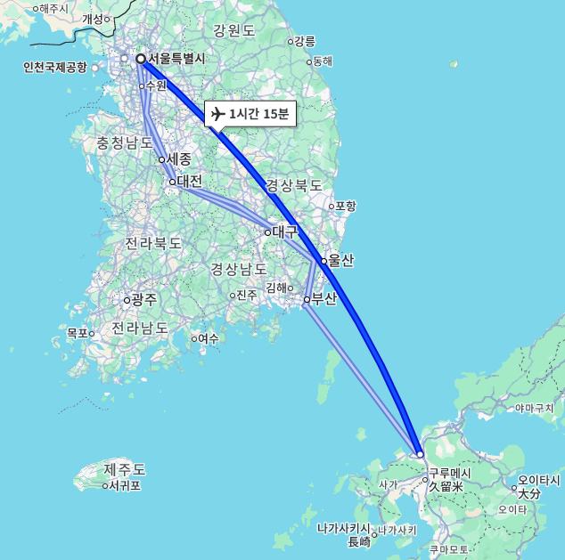 후쿠오카까지는 비행기로 약 1시간 15분,
