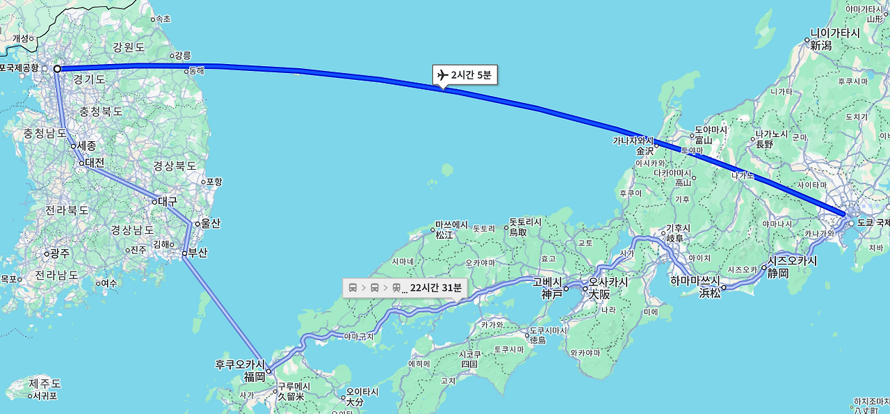그리고 도쿄는 2시간 5분 정도 걸립니다.