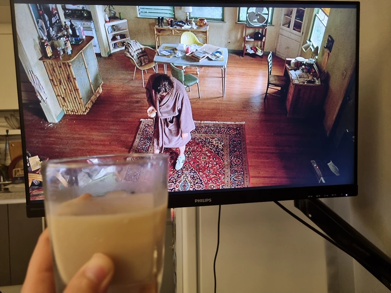 커클랜드 프렌치 보드카, 직접 만든 커피 리큐르, 크림 사기 귀찮아서 집에 있던 우유로 화이트 러시안을 완성했다. 술과 영화 화면을 동시에 찍으려고 노력했는데 생각보다 원하는 구도가 잘 안 나온다. 다음에는 좀 더 고민해서 사진을 다시 찍어봐야지
