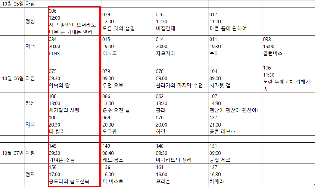 이 엉성한 엑셀 파일은 영화 예매일 전날에 급하게 작성한 예매 후보들이다. '아침, 점심, 저녁에 한 개씩, 2박 3일 동안 총 7개를 보자'라는 목표를 세운뒤, 각 시간대별로 4~5개의 영화 후보들을 선정했다. 선정 기준은 딱 두 가지 '오 시놉시스 대충 보니까 재밌어 보인다', '오 이 감독 신작이 나와?'. 오른쪽으로 갈수록 우선순위는 낮아진다. 그러니까 왼쪽 빨간 칸이 보고 싶은 영화 1순위인 것이다. 그리고 9월 22일 오후 2시, 회사에서 눈치를 봐가면서 티켓팅을 진행하기 시작했다.