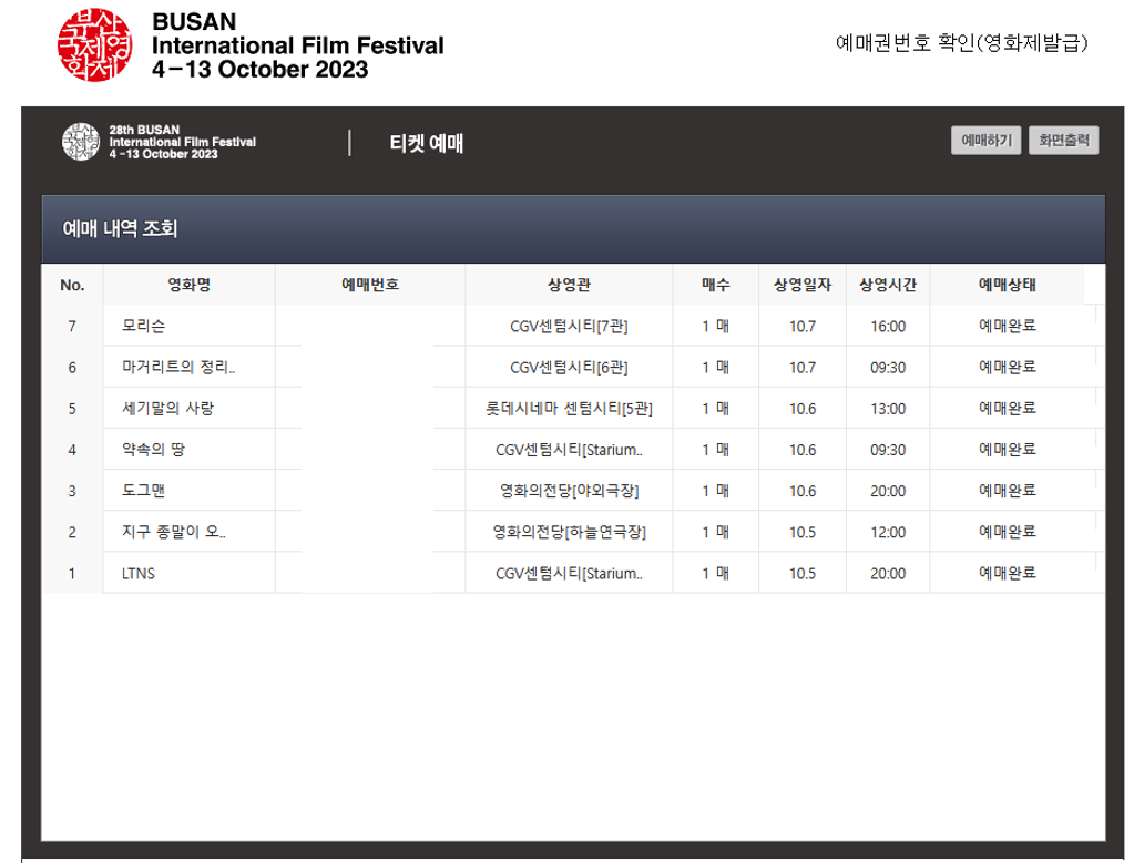 그리고 예매 결과, 시원하게 말아먹었다. 얼핏 보면 1순위들을 꽤 많이 챙긴 것처럼 보인다. 하지만, 가장 먼저 시도했던 데이빗 핀처, 요르고스 란티모스, 미셸 공드리 감독의 신작은 깡그리 다 실패하고 말았다. 영화제 측에서 암표 거래 자제 당부를 공지로 올릴 정도로 치열한 티켓팅 속에서 회사에서 눈치 봐가며 손가락으로 카드 정보 일일이 입력하는 직장인에게 줄 자리 따위는 없었던 것이다. 컴퓨터 전공으로 밥 벌어먹고사는 인간이 카드 정보 입력하다가 다 놓치고 매크로 유저들을 욕하는 것도 참 웃기는 일이다.